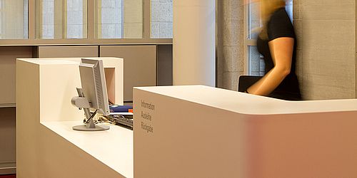The other half of the lockers are available for short-term use during the day. Keys can be obtained at the reference and loan desk against the deposit of an ID card. The locker must be emptied by closing time in the evening at the latest and the key returned to the reference and loan desk.